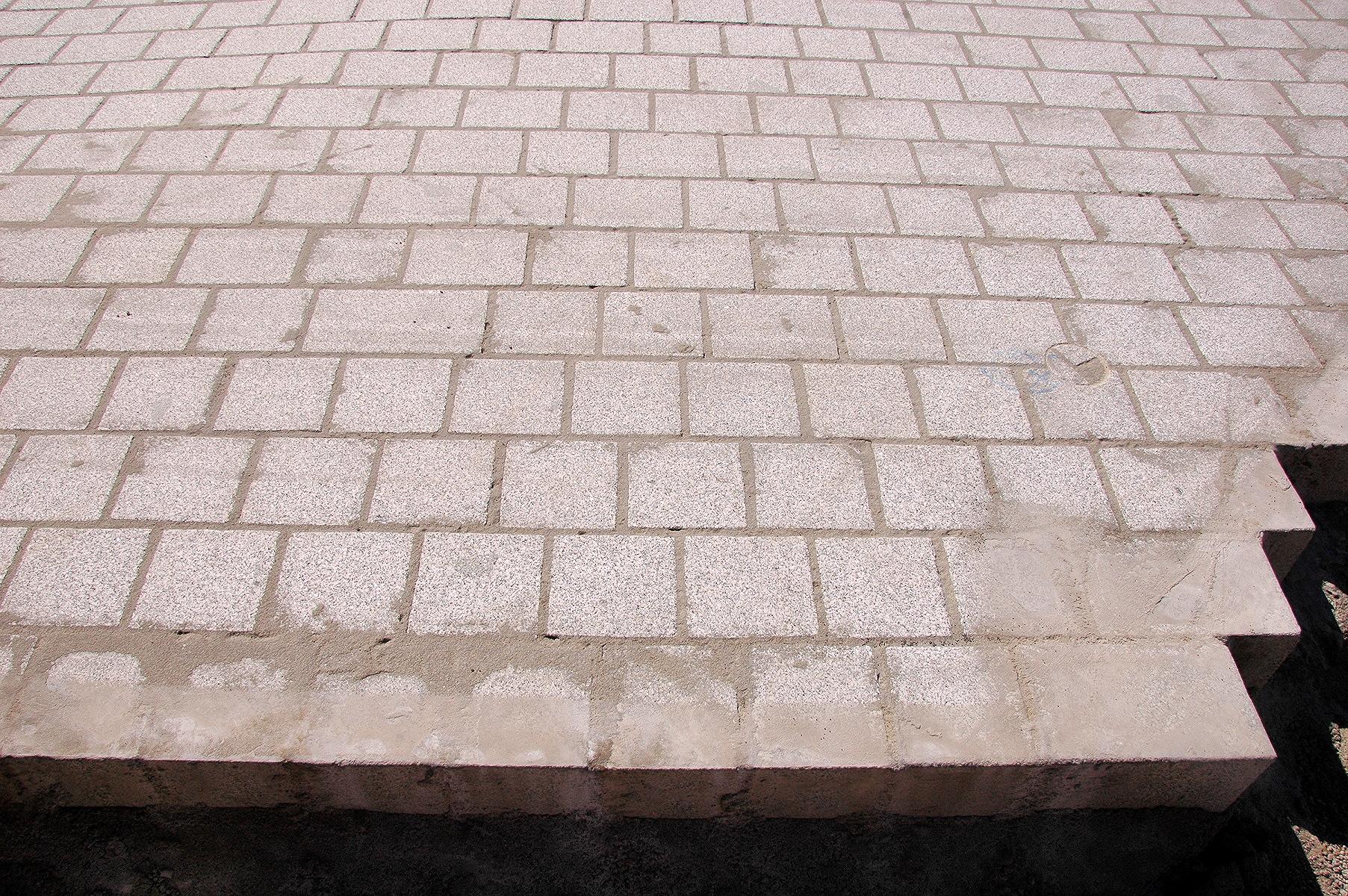 Versetzen von 5-seitig kugelgestrahlten Granitsteinen, Oberseite gesägt.