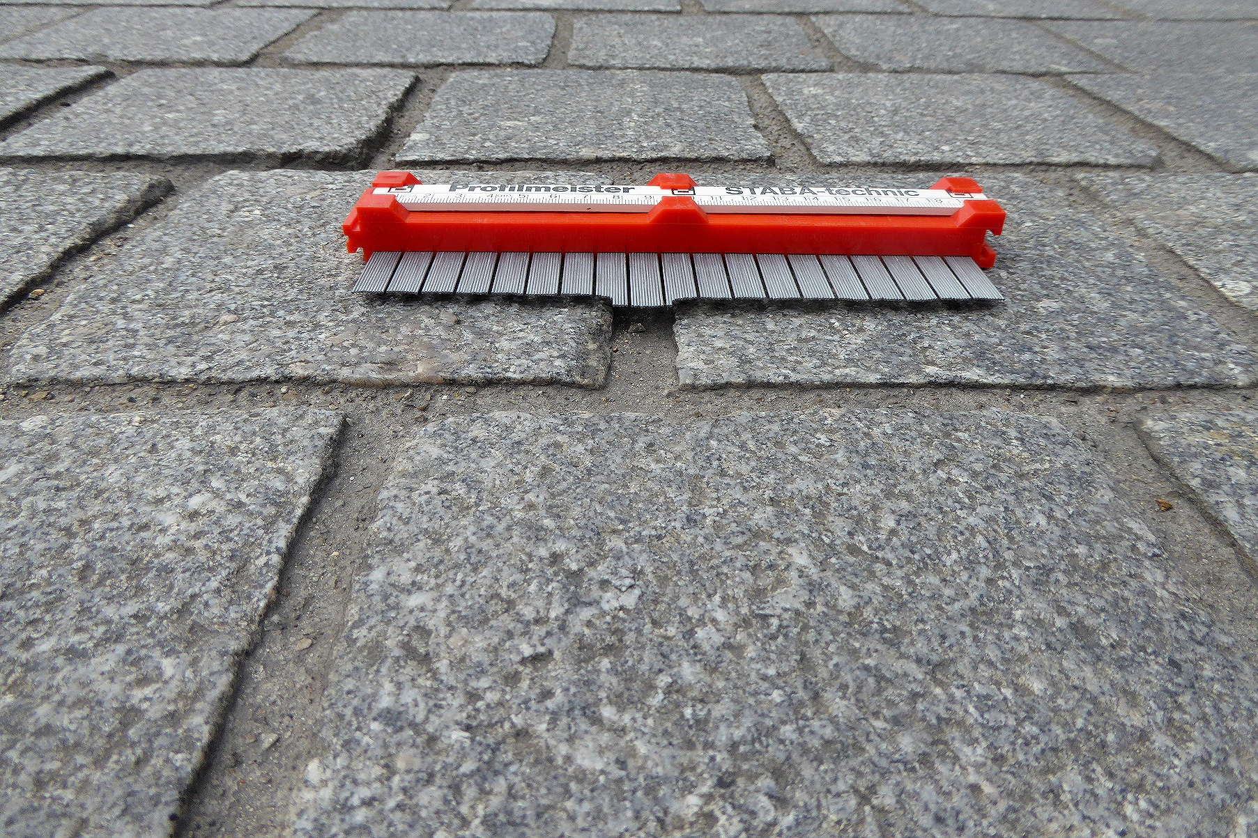 • Bessere Anpassungsmöglichkeiten hinsichtlich Rautiefe, die sich auf die Lärmreduktion auswirkt (sh. Merkblatt für Lärmarme Pflasterbauweisen in ungebundener Ausführung, M LP FGSV 621). Es ist eine Unterschreitung der Werte des M LP anzustreben und erreichbar (noch leiser als dort beschrieben, weil die Fugenvertiefung wegfällt oder reduziert wird).